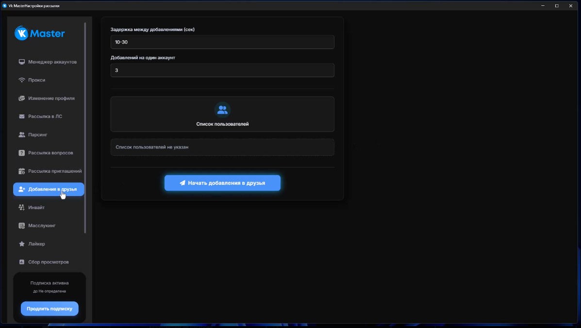 VK Master поддерживает использование прокси-серверов, что позволяет безопасно работать с большим количеством аккаунтов, снижая риск их блокировки.