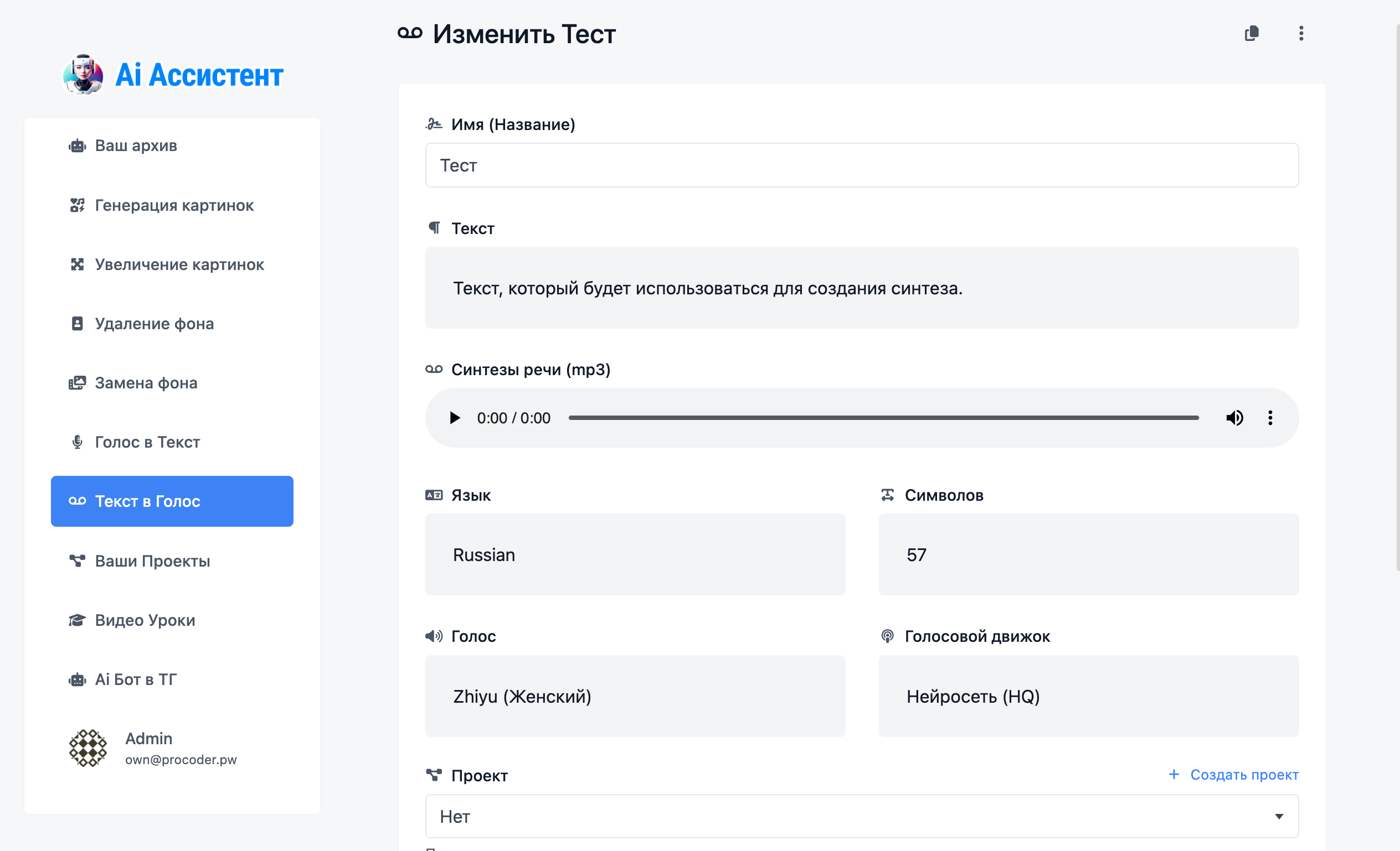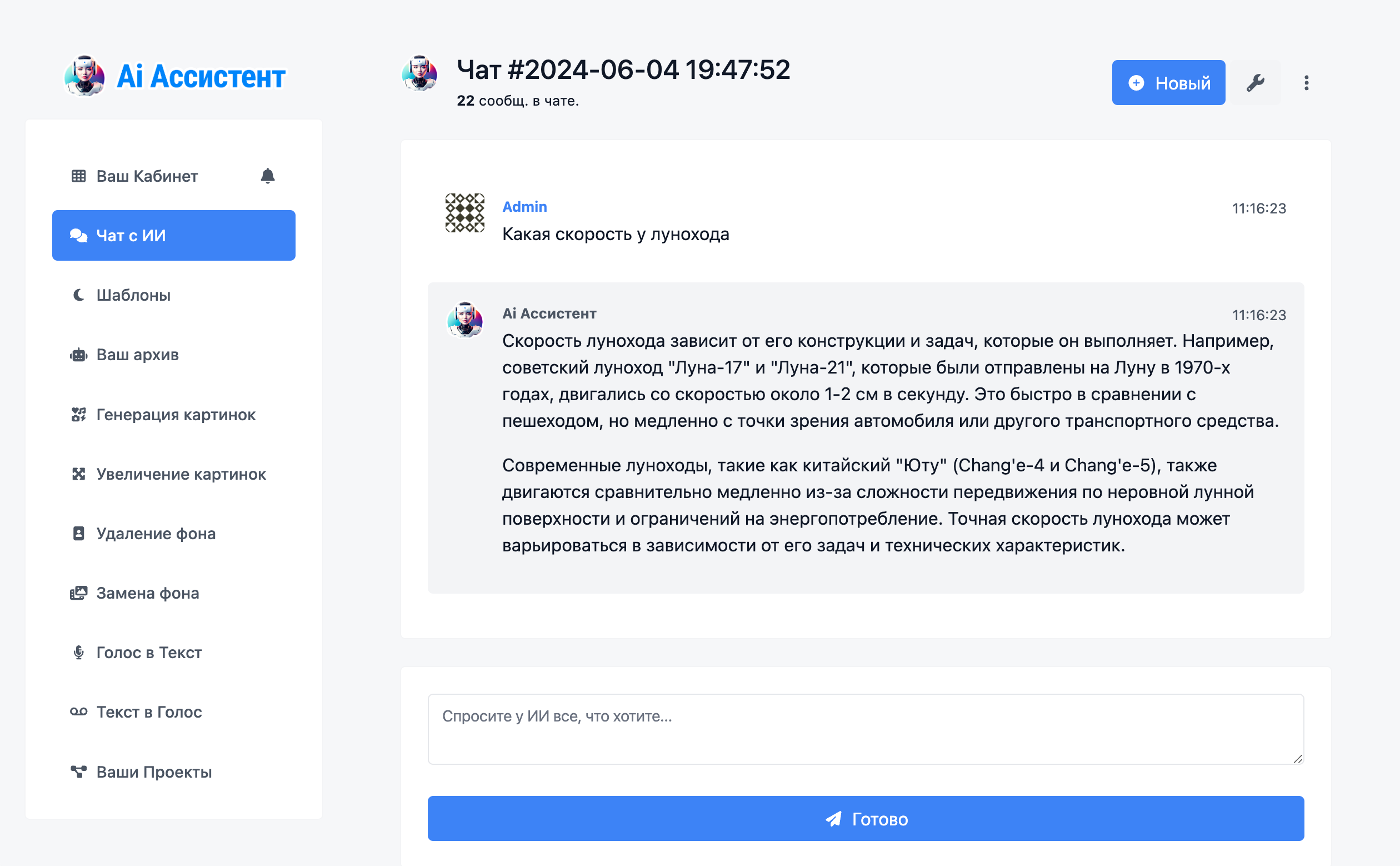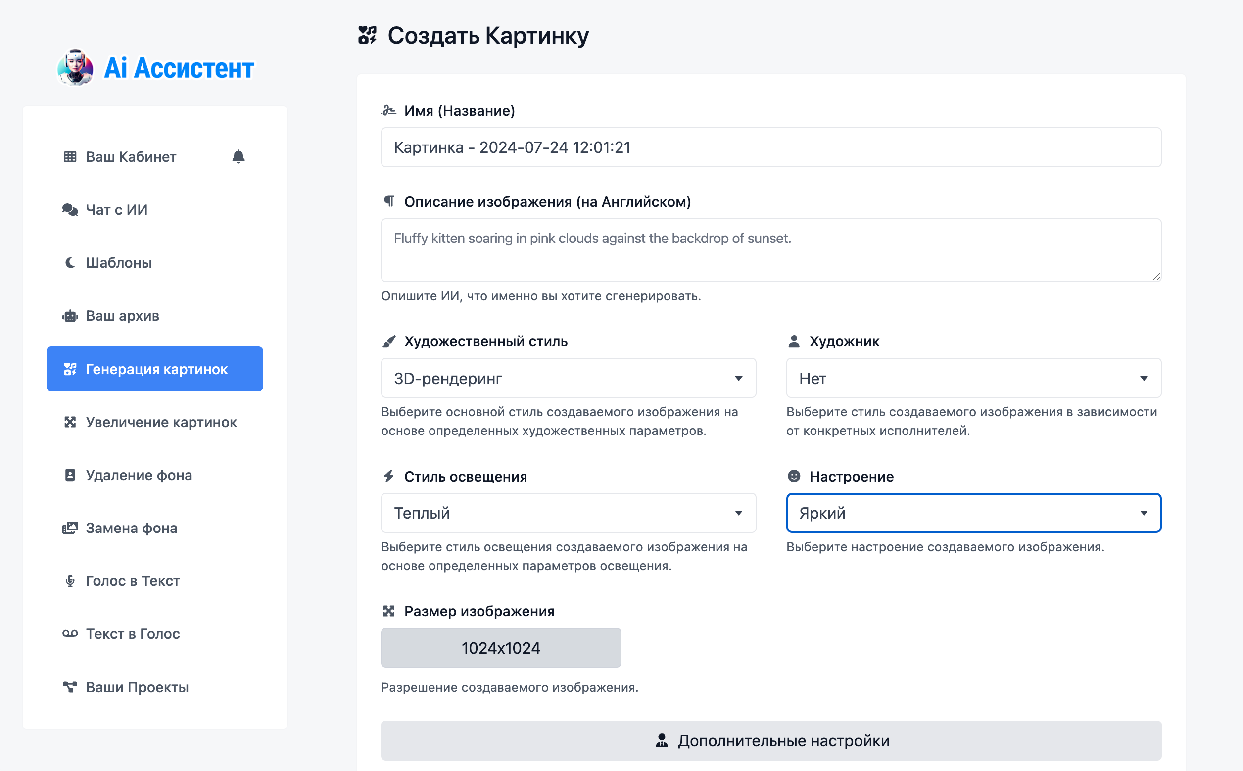AI Assistant – это онлайн-сервис, предназначенный для использования ИИ в различных сферах деятельности. Сервис предоставляет инструменты для автоматизации создания контента, включая генерацию текстов, изображений и аудио.