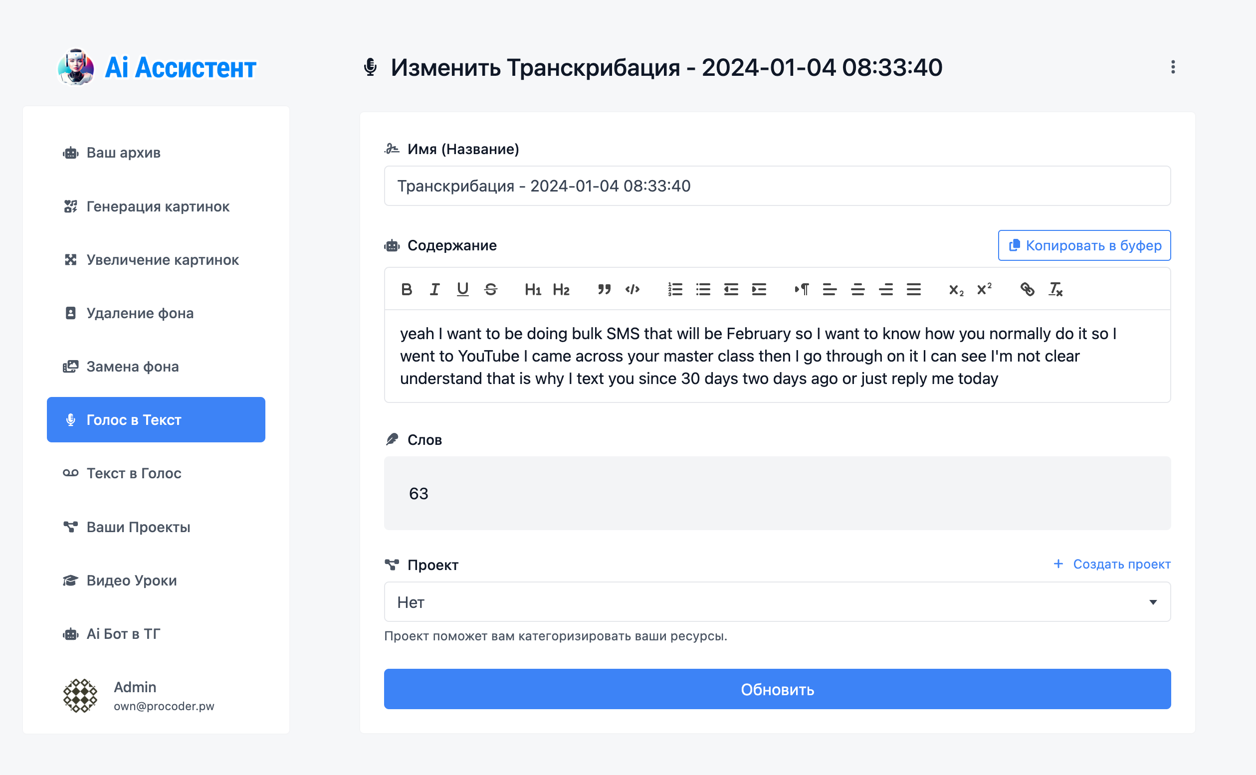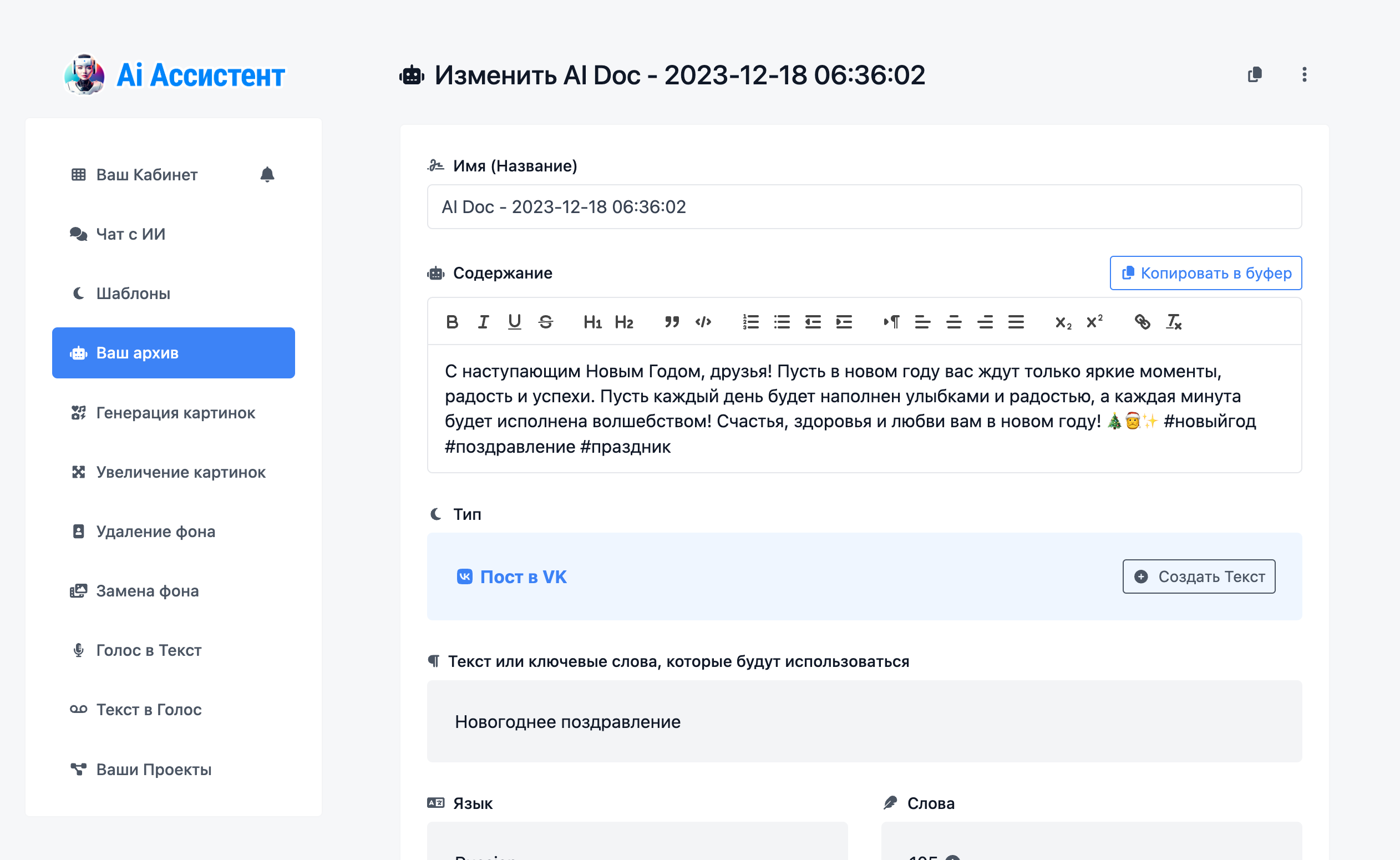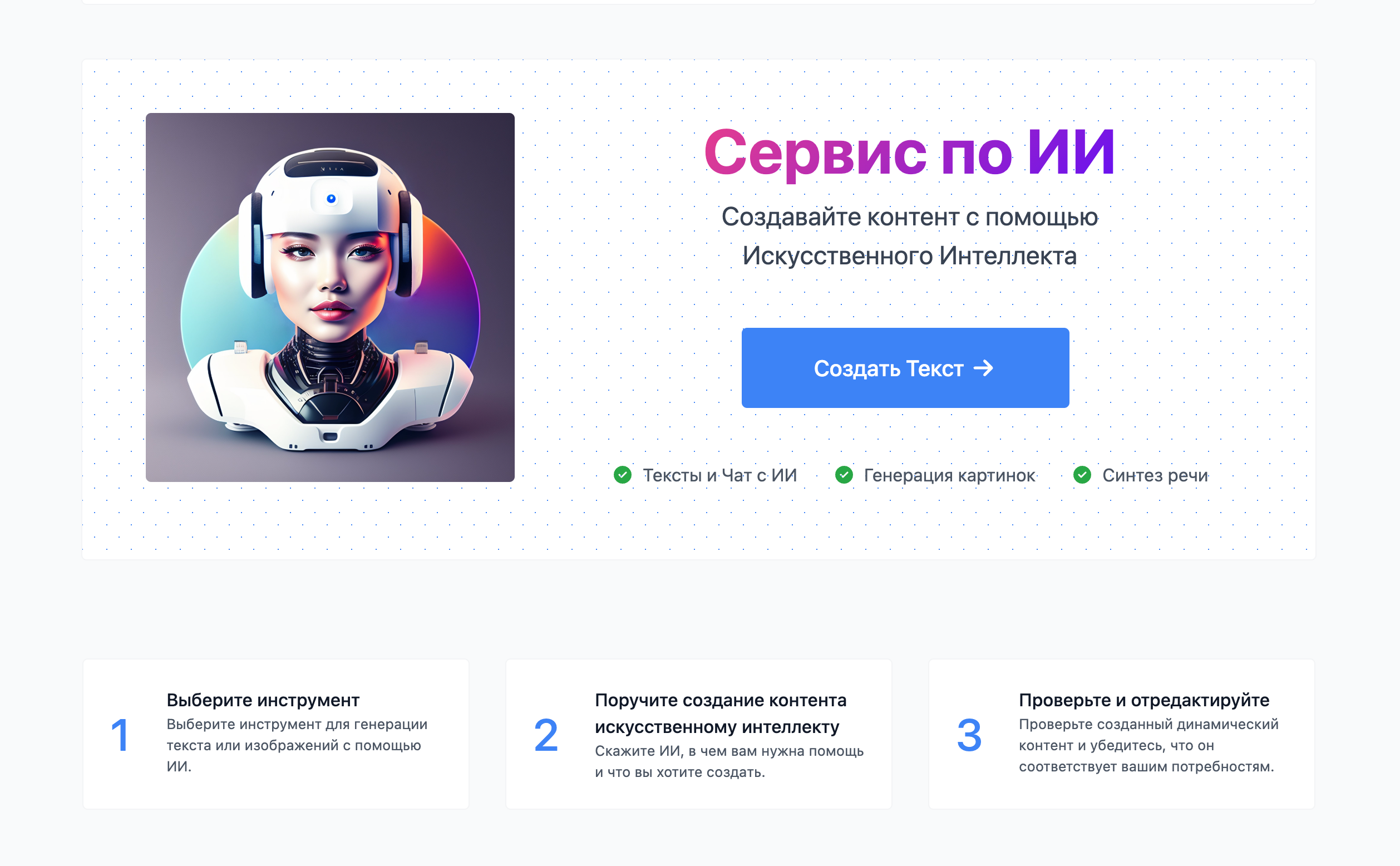 AI Assistant – это онлайн-сервис, предназначенный для использования ИИ в различных сферах деятельности. Сервис предоставляет инструменты для автоматизации создания контента, включая генерацию текстов, изображений и аудио.